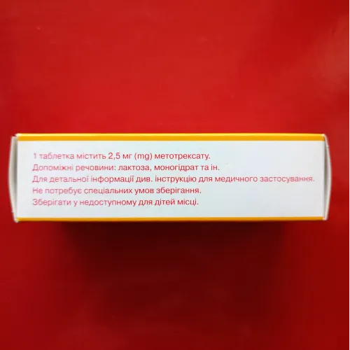 Категорично уникати алкоголю. Передозування: гематемезис, мієлосупресія, ниркова/печінкова недостатність – антидот лейковорін (фолінієва к-та) 100 мг/м² в/в негайно, потім кожні 6 год ×36–48 год. Фармвзаємодія: посилює сульфаніламіди, НПЗЗ (ібупрофен), саліцилати, фенітоїн, ретиноїди, протипухлинні (цисплатин). Не з живими вакцинами. Жінки/чоловіки – контрацепція 6 міс після терапії. Не для самолікування. Зберігати <25°C, сухе темне місце, подалі від дітей. Термін придатності 3 роки. Упаковка: блістер 10 табл. по 2,5 мг. Відпуск: рецептурний. Ціна блістера ~100–250 грн.